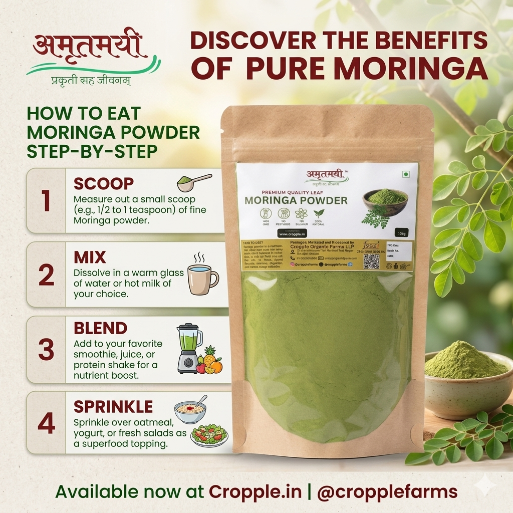 Moringa Leaf Powder is a natural superfood made from finely dried moringa leaves, rich in essential nutrients like protein, iron, and calcium. It supports immunity, boosts energy, and promotes overall health, making it a perfect addition to your daily diet.