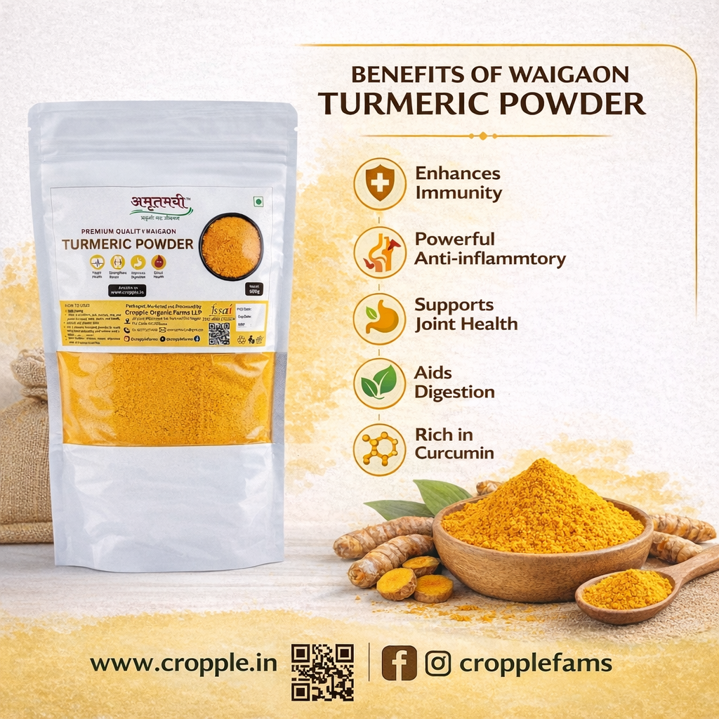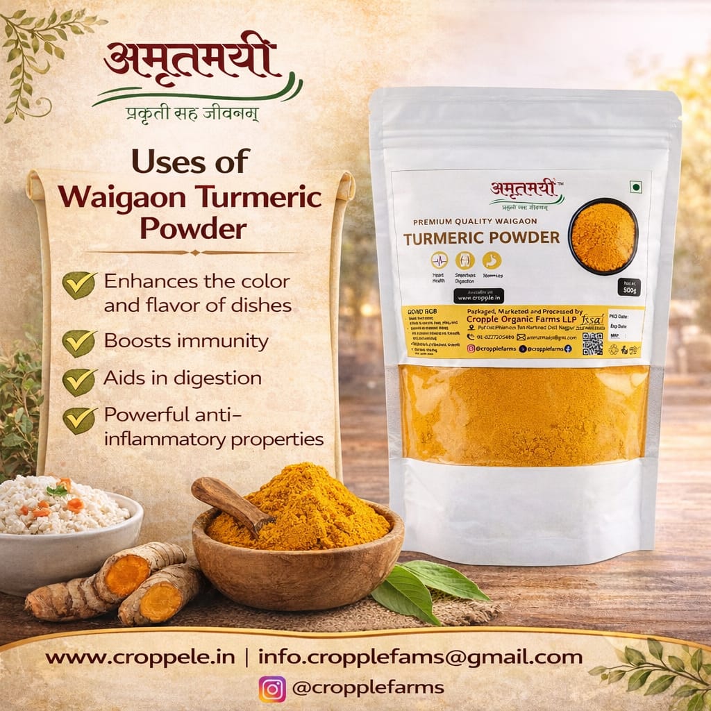 Waigaon Turmeric Powder is a premium quality turmeric from Waigaon, Maharashtra, a region famous for producing highly aromatic and bright yellow turmeric. It is naturally rich in curcumin, which gives it strong color, flavor, and health benefits. This turmeric is widely used in Indian cooking, traditional medicine, and daily health drinks. It adds natural taste, color, and nutrition to food while supporting immunity and overall wellness.